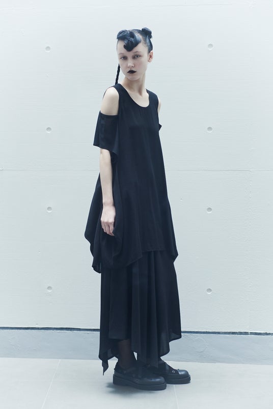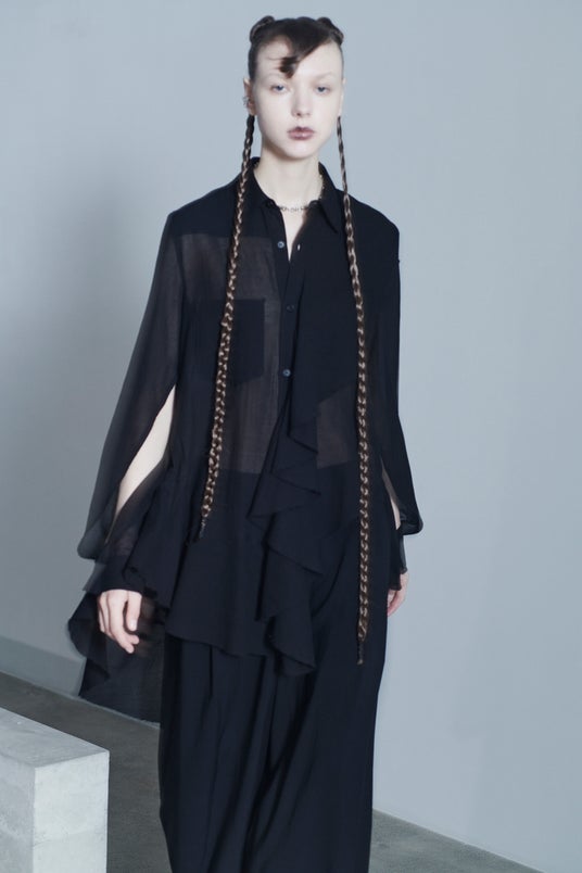 ソフトなIラインが特徴的なシアーブラックのドレスとロングブラウスシリーズ、リラクシングなカットオフショルダーブラウスやフレアパンツ、サスペンダーを組み込んだデザインカッソーのアイテムが登場いたします。