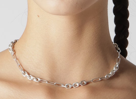 Silver925を使用。品のある落ち着いた輝き、デザインの異なるチェーンを交互にリンキングした仕様