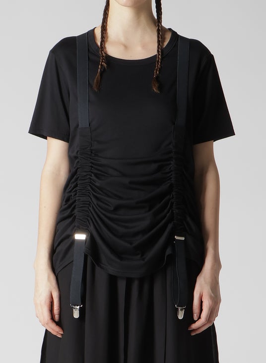 Y型サスペンダーが組み込まれたTシャツ、クリップエンドタイプ、金具の絞り位置で着丈が変化、セルロースコットン