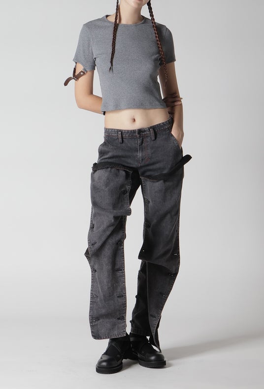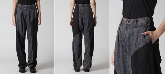 グレーデニムとブラックデニムの組み合わせ、グラフィカルなブラックデニムパーツ、赤ステッチ、後身頃に玉縁ポケット、製品に特殊な脱色加工を施したヴィンテージ感、コットンデニム