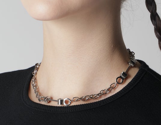チェーンの両端を内側に折り込んだ三ッ組チェーンに、*カップリングと大ぶりなピアスを加えたパンキッシュな組み合わせ、メタル