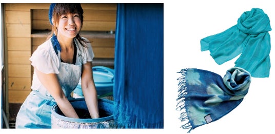 【画像:上】日本大青で染めた西陣織ショール 121,000円(限定3点)