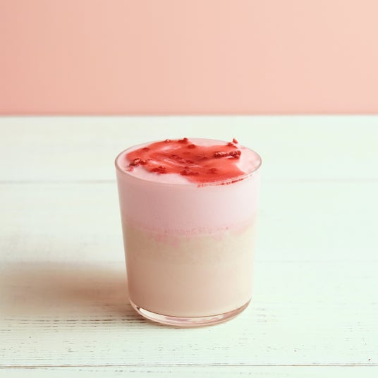ライチとラズベリーによる果実の甘さと甘酸っぱいいちごを加えたミルクに、自家製の桜風味のホイップクリームをトッピング。