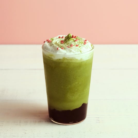 静岡県産の香り高い抹茶を使用したフローズンに、黒糖と桜の塩漬けを加えた桜風味の小豆入りソースを合わせました。