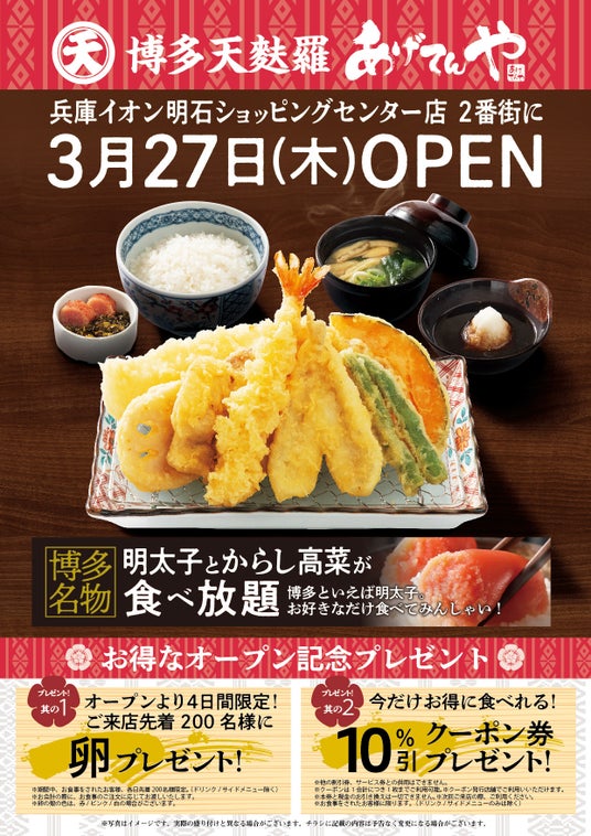 春夏秋冬、季節ごとの旬の素材をこだわりの「新鮮な油」を使用して、サクッと香ばしく揚げた天ぷらが自慢の「あげてんや」兵庫イオン明石店が3月27日(木)にグランドオープンいたします。「博多」をコンセプトにした運営スタイルで定食もしくはセットメニューでは「明太子とからし高菜」食べ放題でございます。そして、今回はオープン特別記念プレゼントを2種類ご用意しております。「卵」と「お得なクーポン券」でございます。(プレゼントのお渡しには条件がございます。ページ2に記載をさせていただきます。)どうぞ、この機会にご利用ください。皆様のご来店をスタッフ一同お待ちしております。何卒よろしくお願い申し上げます。