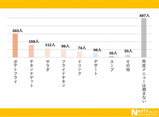 チェーン店のピザを購入する際、よく購入するサイドメニューはどれですか?という質問を複数選択可で行ったところ、「ポテトフライ」が303人、「チキンナゲット」が159人、「サラダ」が112人という順になり、ポテトフライが1番人気なことが分かりました。