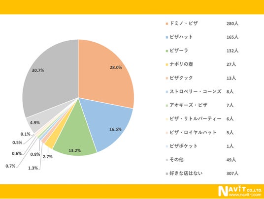 一番好きなピザのチェーン店はどれですか?という質問については、「ドミノ・ピザ」が28.0%、「ピザハット」が16.5%、「ピザーラ」が13.2%という順になりました。