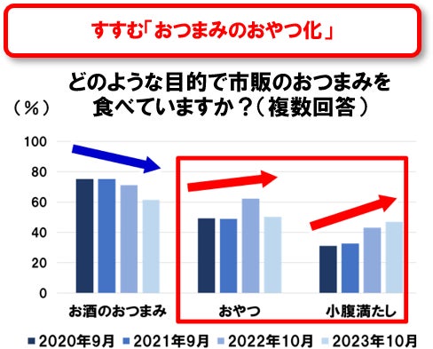 ライフスタイルの変化により、3食の食事をしっかりと摂るのが難しい人が多くなっています。これまでおつまみはお酒のお供として食べることがメインでしたが、間食で不足する栄養素を補うという食べ方が増えてきています。当社アンケートでも、おつまみを食べる目的としてお酒のお供だけでなく、おやつや小腹満たしとして食べる人が増えており、おつまみの価値が多様化しています。