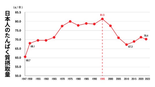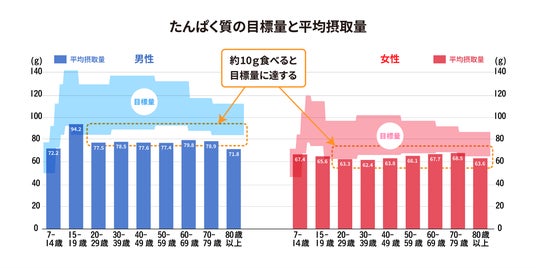 日本人のたんぱく質摂取量は、朝食の欠食や若い女性の極端なダイエット等により、1995年をピークに減少傾向にあり、現在は1950年頃の水準まで落ち込んでいます。また厚生労働省が示す生活習慣病予防を目的としたたんぱく質の目標量に、10g程度届いていません。