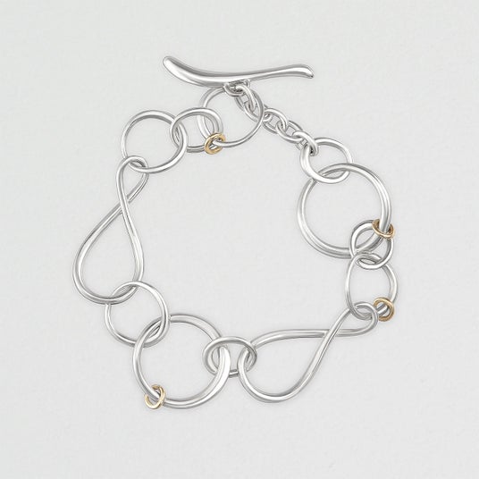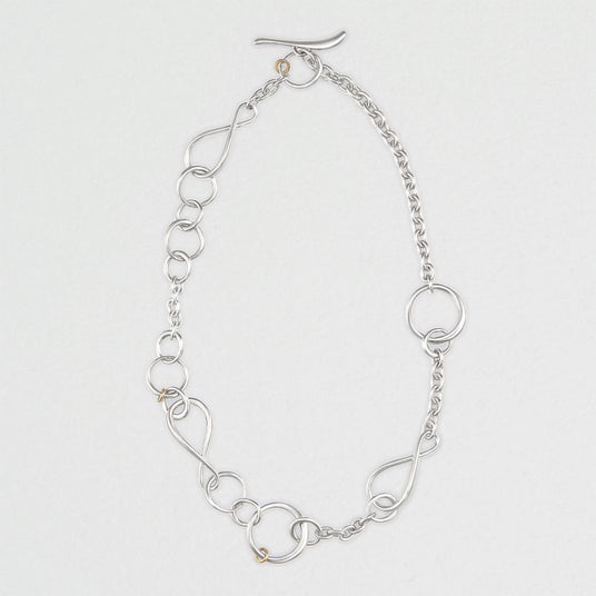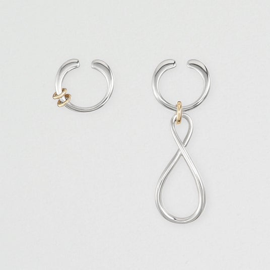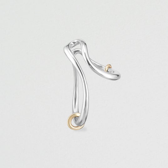 ランダムに繋いだ様々な形状の輪が生み出す心地よいボリューム感と、無垢なシルバーにさりげないアクセントをプラスするゴールドパーツとの繊細なコンビカラーで、コーディネートをスタイリッシュに仕上げてくれるジュエリーがラインナップ。