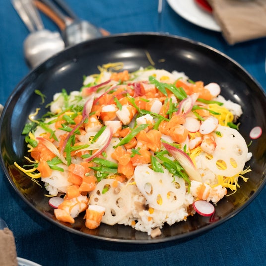 2. 1を器に盛り付け、錦糸卵、大葉、蓮根の甘酢漬け、茗荷の甘酢漬けの順で散らし、サーモンとエビを乗せる。