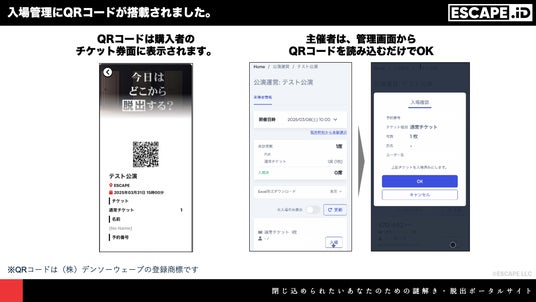 ESCAPE合同会社(所在地:東京都品川区、統括プロデューサー 佐々木 翼)の運営する謎解き・脱出ゲームに特化したチケットポータルサイト「ESCAPE.ID」は、二次元バーコードによる入場処理機能を新たに追加しました。お客様の入場チケット券面に二次元バーコードを表示することで、スタッフによる入場処理がスムーズとなり、より快適な公演参加体験を実現します。