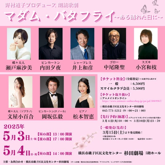 「野村道子プロデュース朗読歌劇『マダム・バタフライ~ある晴れた日に~』」を、2025年5月3日(土)~4日(日)に横浜市磯子区民文化センター杉田劇場にて上演いたします。
