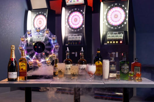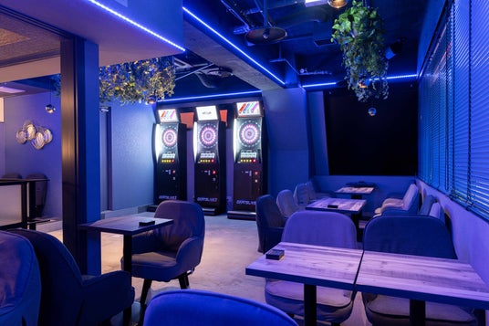 10階 青いネオンが映える都会的なデザインのダーツエリア