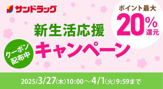 さらに、「サンドラッグ.com」において、対象商品のご購入で最大20%のポイント還元やおトクにご購入いただけるPontaパス会員限定の割引クーポンなど新生活応援キャンペーンを開催します。