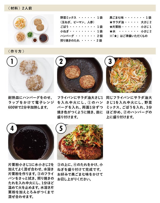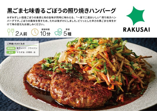 包丁いらず10分で完成。時短RAKUSAIミールキット『黒ごま七味香るごぼうの照り焼きハンバーグ』3/24販売