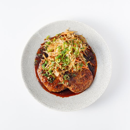 みずみずしい国産ごぼうの食感と肉の旨味が同時に味わえる、“一度で二度おいしい”照り焼きハンバーグです。ごぼうの風味を残すため、たれは後がけにしました。ピリっとした辛さの黒ごま七味をかけて味の変化もお楽しみください。