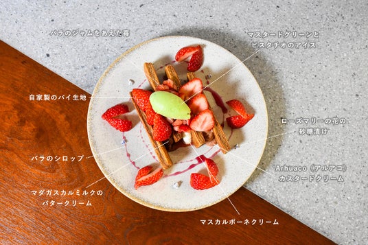 サクほろ食感のパイに3種のクリームとたっぷりの苺を重ねながら、華やかなバラや青みを感じるマスタードグリーンなども用いることで、春らしさを存分に感じられる一皿に仕上げました。