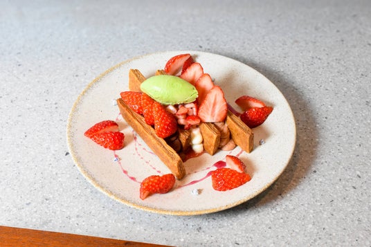 ピスタチオの甘さと、マスタードグリーンの爽やかな青みが楽しめるアイスです。クリームや苺と合わせることで、全体の味わいに爽やかな春らしさが増します。