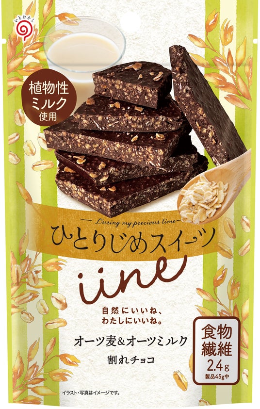 「ひとりじめスイーツiine オーツ麦&オーツミルク」は、生活習慣病の予防やヘルシー志向など健康意識の高まりや、環境保護や食糧危機問題の解決などの社会課題解決の観点からも注目される植物性ミルクに着目した商品です。第3のミルクと呼ばれ市場の盛り上がりも見られるオーツミルクを使用したチョコレートにオーツ麦のグラノラを混ぜ込みました。オーツミルクの優しい味わいとザクザク食感が楽しめるチョコレートです。