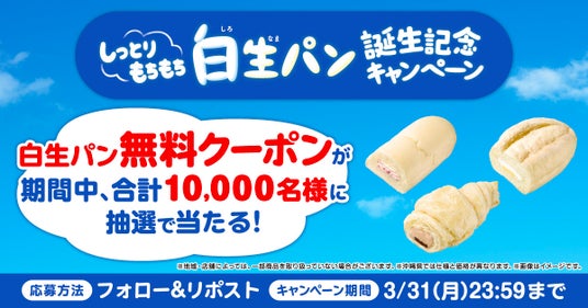 ファミリーマート公式Xアカウント(@famima_now)をフォローの上、対象ポストをリポストすると、抽選で10,000名さまに「白生コッペパン(つぶつぶいちご&ホワイトチョコ)」、「白生クロワッサン(ダブル生チョコ)」、「白生フランスパン(北海道産ダブル練乳ミルク)」のいずれか1品の無料クーポンが抽選で当たります。