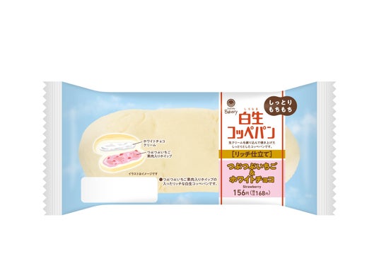 【内容】生クリームを加えたしっとりもちもちとした白生コッペパンに、つぶつぶいちご果肉入りのホイップとホワイトチョコクリームをサンドしました。