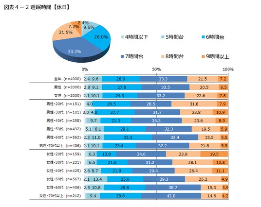 休日の場合(図表4−2)、1位と2位が逆転して、「7時間台」(33.3%)、「6時間台」(26.0%)の順になります。また「8時間台」は平日と比べて10ポイント以上増え、21.5%です。