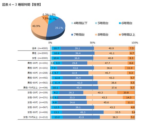 ちなみに、理想の睡眠時間について「9時間以上」と回答した人は全体では7.5%ですが、「女性・20代」においては20.8%、「女性・30代」では14.3%と、男性やほかの年代の女性と比べて、高い割合になっています。