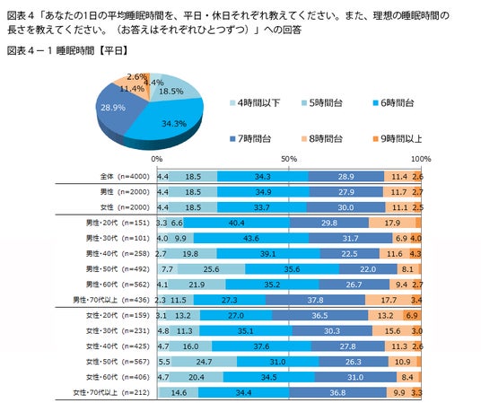 平日の平均睡眠時間、休日の睡眠時間、そして理想の睡眠時間について、それぞれ聞きました(図表4)。