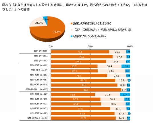 目覚ましを使っている人に、設定した時間に起きられているかを聞くと(図表3)、「設定した時間にきちんと起きられる」という人は73.8%、「(スヌーズ機能などで)何度も鳴らしたら起きられる」人が21.3%でした。