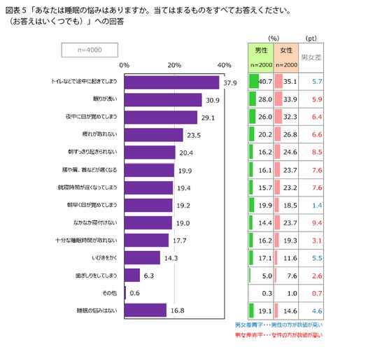 満足できていない人はどんな理由があるのでしょうか。睡眠の悩みを聞いたところ(図表5)、最も割合が高かったのが「トイレなどで途中に起きてしまう」(37.9%)でした。性年代別に見ると(性年代別の図表は不掲載)、「男性・60代」(50.9%)、「男性・70代以上」(58.9%)、「女性・70代以上」(50.9%)では、理由に挙げた人が半数を超えています。同様に「夜中に目が覚めてしまう」も、年代が上がると増える傾向があります。