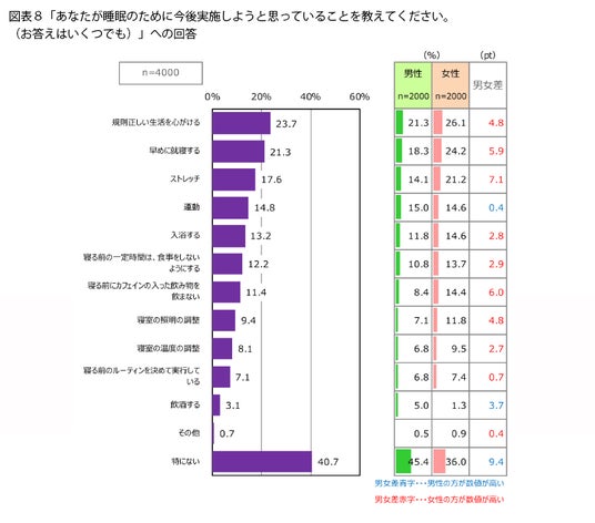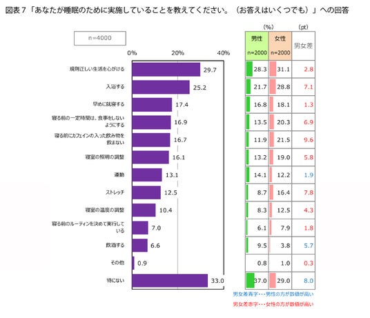 実施していることとしては、「入浴する」(25.2%)、「早めに就寝する」(17.4%)のほか、「寝る前の一定時間は、食事をしないようにする」(16.9%)、「寝る前にカフェインの入った飲み物を飲まない」(16.7%)が上位になっており、食生活を含めた生活習慣に気をつけている人が多いようです。