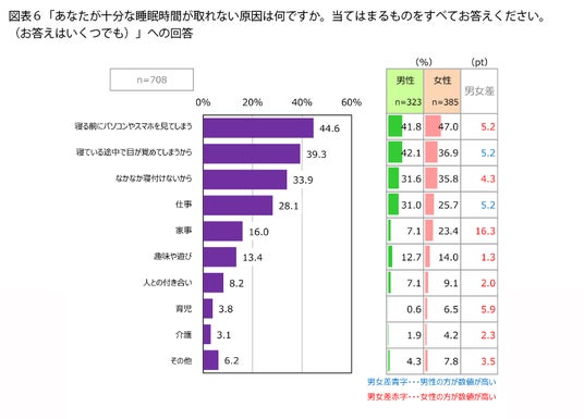 睡眠の悩みとして「十分な睡眠時間が取れない」という人を対象に、その原因を聞きました(図表6)。