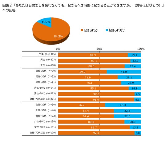 普段目覚ましを使っていない人のうち、起きるべき時間に起きられている人は8割以上でした(図表2)。ただし、年齢が若いほど「起きられない」人の割合が高いです。