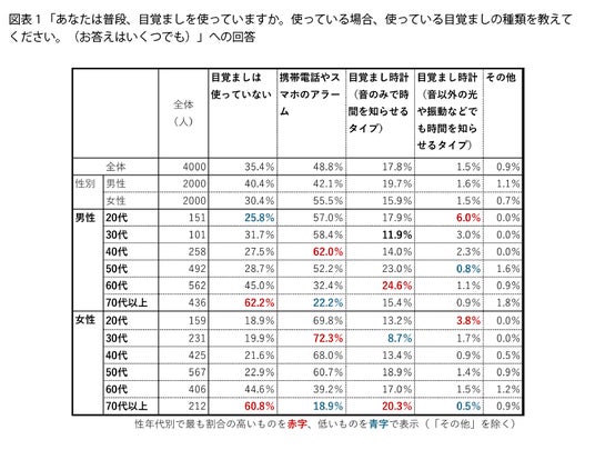 普段、目覚ましを使っているかを聞くと(図表1)、「携帯電話やスマホのアラーム」を使っている人が48.8%、音のみで時間を知らせる「目覚まし時計」を使っている人が17.8%、「目覚ましは使っていない」という人が35.4%でした。
