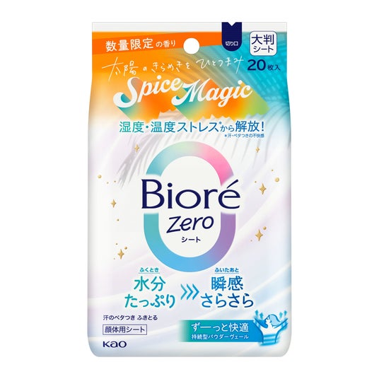 そこで、今年は『ビオレUV アクアリッチ アクアプロテクトミスト』に加え、『ビオレZero シート』からも、新しい香り「スパイスマジック」を数量限定発売いたします。「スパイスマジック」の香りは、はじける果実と華やかなフローラルの香りに、太陽のきらめきをひとつまみしたイメージで作りました。暑い日も、「スパイスマジック」の香りでポジティブな気持ちで過ごしてほしいというビオレの想いを込めています。