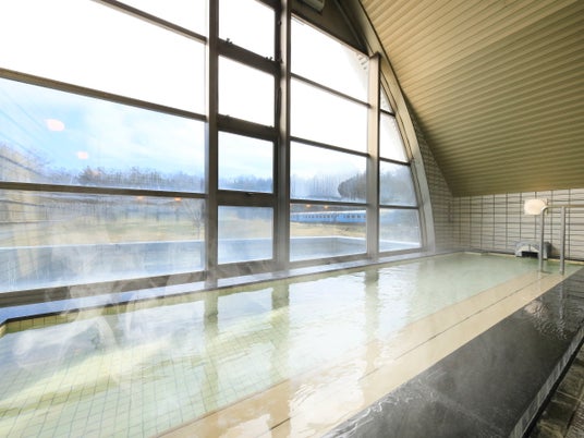 湯船から列車が見える開放感あふれる温泉浴場で嬬恋バラギ温泉の湯をお愉しみいただけます。