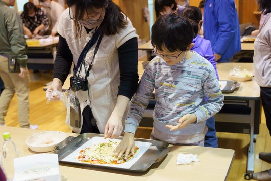親子で楽しみながら、本格的な煉瓦造りのピザ窯でピザ作りを体験しました。一人ひとりが自分で生地を伸ばすところから、トッピングをのせて、焼き上げまでの工程を行い、焼きたてのピザを楽しみました。