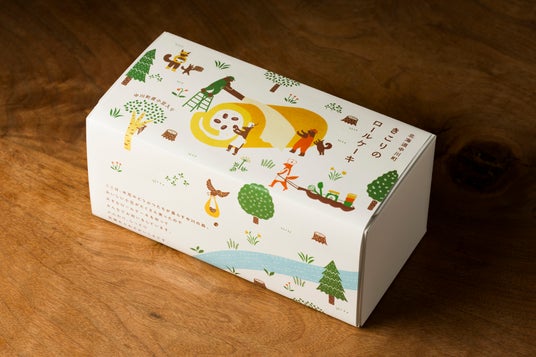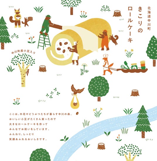 森の動物たちがおやすみ時間に川辺に集まっている様子を描いています。森に囲まれた中川町の魅力が伝わるデザインで、「きこりが食べるおやつ」をテーマに、かわいらしいパッケージとなっています。北海道で活動するデザイナーの早苗優里さんが手掛けました。