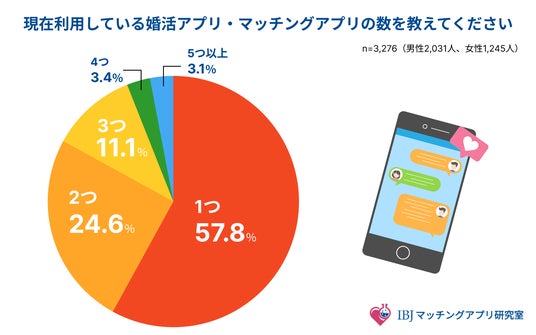 現在利用している婚活アプリ・マッチングアプリの数は、1つのみが57.8%、2つ以上が42.2%と単独利用派が15.6ポイント高い結果となりました。男女別に見ると、「1つ」の回答が男性55.8%、女性61.0%と女性のほうが5.2ポイント高い傾向に。