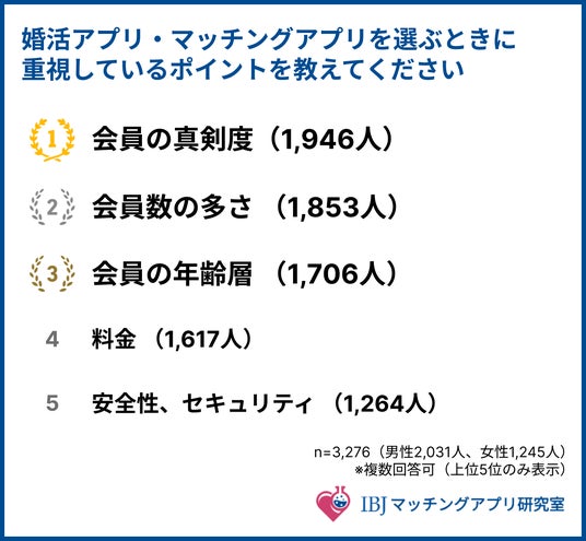 婚活アプリ・マッチングアプリを選ぶときに重視しているポイントは、1位「会員の真剣度(1,946人)」、2位「会員数の多さ(1,853人)」、3位「会員の年齢層(1,706人)」がトップ3となりました。これは、利用者がアプリ自体の機能や使いやすさよりも、出会える相手の質を最も重視していることを示しています。