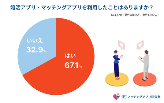 婚活中の男女に婚活アプリ・マッチングアプリの利用経験を聞いたところ、67.1%が利用したことがあると回答しました。