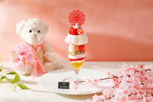 ザ ストリングス 表参道(所在地:東京都港区北青山3-6-8、総支配人:宮田宏之)では、1階「Cafe & Dining ZelkovA(カフェ&ダイニング ゼルコヴァ)」にて、“桜&いちご×お茶&ピスタチオ”のダブルコンビネーションが織りなす味わいと、フリルをまといおめかしした可愛らしい見た目を楽しむ春の新作パフェを、2025年4月3日(木)~4月30日(水)の期間で提供いたします。ストリングスベアも桜色のオシャレなスカーフを巻いた春の装いでパフェと一緒に登場し、皆さまをあたたかく歓迎いたします。