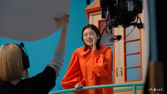 オレンジのワンピースで現れた小芝さんは、スタジオに出現したオリジナルの塔にテンションが上昇。「ごはんいこー!」と言う人々を見守る役を、終始楽しみながら撮影を行いました。