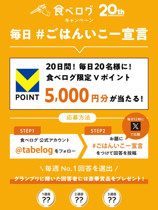 X上では、「20」周年にちなみ、毎日20名様に20日間連続で、食べログ限定のVポイント5,000円分を進呈する“毎日「#ごはんいこー宣言」Xキャンペーン”を開催します。