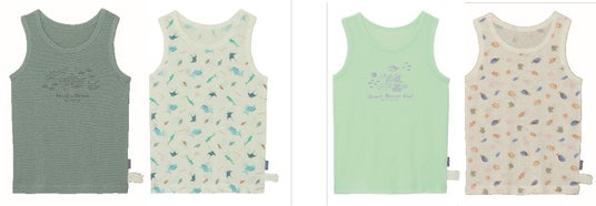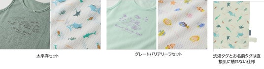 「太平洋」、「グレート・バリア・リーフ」のそれぞれに生息する海の生き物をデザインした2枚セットのインナーです。綿100%のメッシュ素材を使用し、さらっと快適な着心地が特徴です。洗濯タグとお名前タグはインナーの外側につけ、直接肌に触れない工夫を施しています。