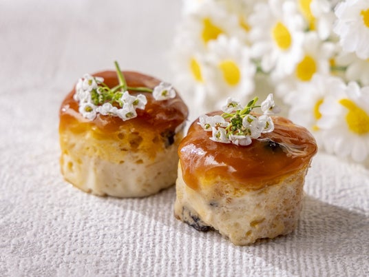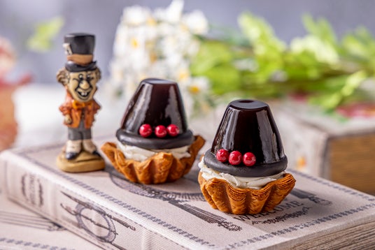 ‘おかしなお茶会’のバター付きパンから着想を得た「バター付きパンのプディング 塩キャラメル乗せ」はバターをたっぷり使用したふわふわパンプディングで、塩キャラメルの甘さが優しい味わいです。その他にもザクザクのクロワッサン生地のカップの上にダークコーヒーゼリーを乗せ、まるでシルクハットのように仕上げた「ハッター」など、物語の中に入り込んだような小さなパンの数々に心が躍ります。