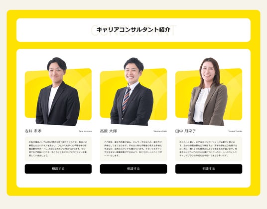 当社の人材業界歴10年以上のベテラン社員が、当サービス専属のキャリアアドバイザーとして20代の皆さまの転職をサポートします。履歴書作成についてアドバイスしたり、面接通過のためのオンラインセミナーを実施したりします。