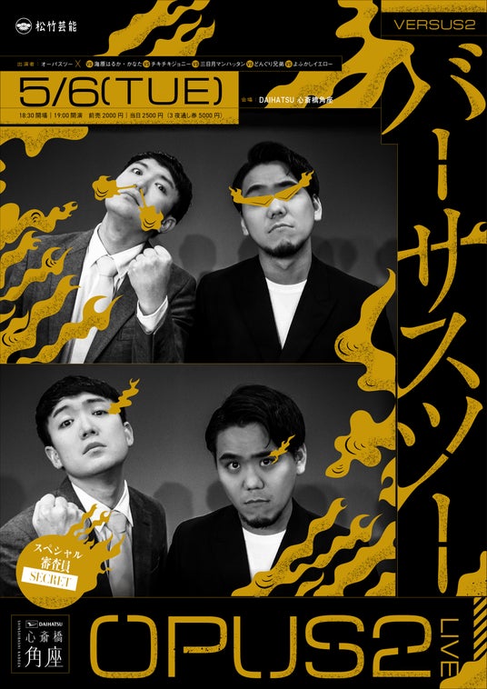そして最終日5月6日(火・祝)は、2025年ytv漫才新人賞予選ラウンドにて松竹芸能初の1位通過、また第60回上方漫才大賞「新人賞」にノミネートされた「オーパスツー」が自身のベストネタを引っ提げて先輩ゲストとネタ5番勝負に挑むライブ「バーサスツー」を開催。審査員には特別ゲストを召喚予定!