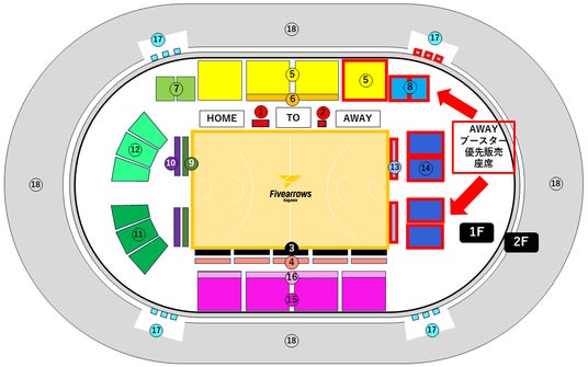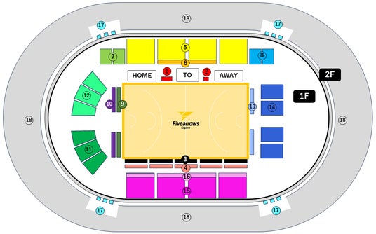 ※あなぶきアリーナ香川メインアリーナでの開催時は、HOMEベンチとAWAYベンチが高松市総合体育館開催時と反対に設置されますのでご注意ください。1Fメイン指定席から見て左側がHOMEベンチ、右側がAWAYベンチとなります。